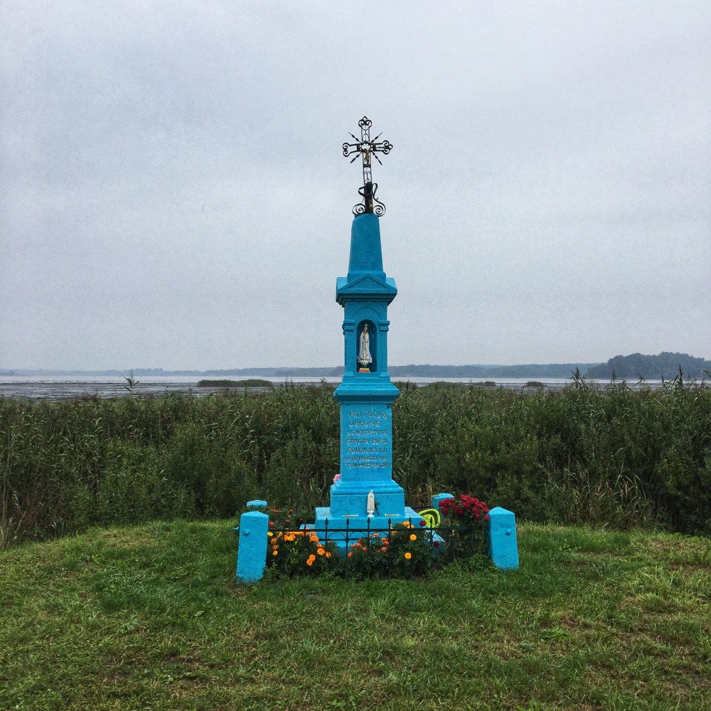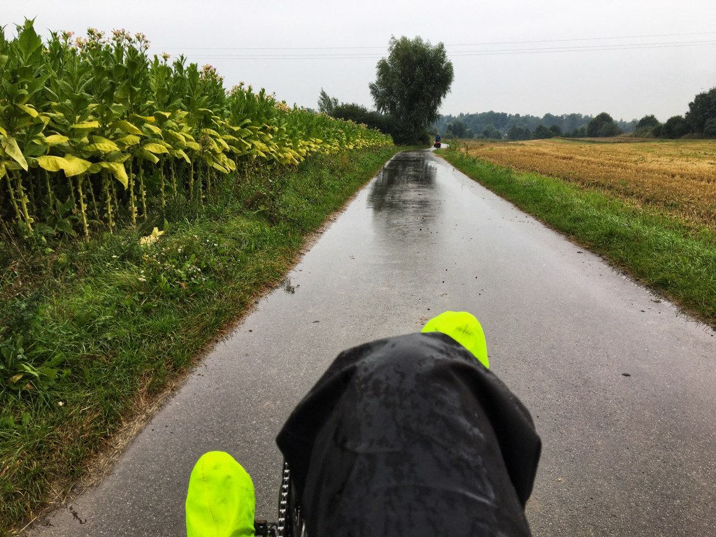 De dag start druilerig. Het is grijs en het miezert. Tijd voor overschoentjes! De route gaat langs velden vol tabak en bermen met kleurige mariabeelden. Het is een mooi pad in slecht weer. Bossen, weides en dorpjes wisselen elkaar af, gravel en gladde asfalt, het glooit aangenaam, heuvels tekenen zich af.