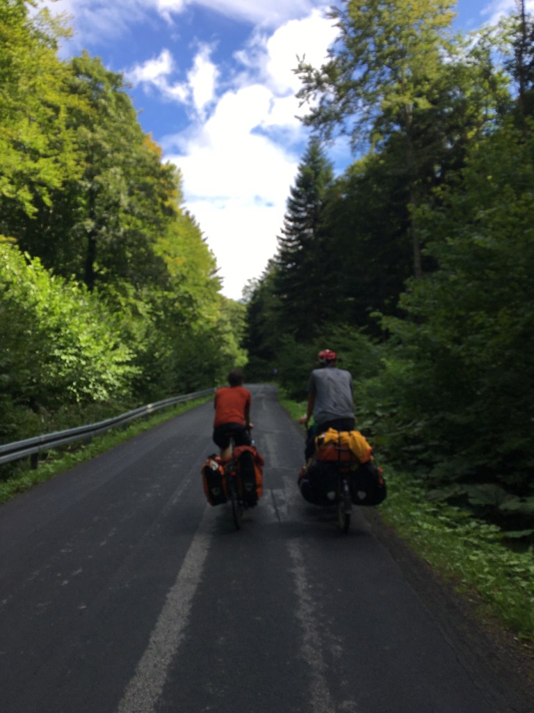 We verlaten de stad en rijden al gauw langs een hoofdweg de heuvels in. Meteen is de sfeer en het gevoel helemaal anders dan wat we in Polen hebben ervaren. De weg kronkelt, stijgt en daalt van dorpje naar dorpje. Het is groen en mooi fietsen. Het wordt ook al snel pittig. Halfweg het eerste klimmetje moeten Nanou en ik al even op adem komen voor we verder trappen maar we raken daarna makkelijk boven.