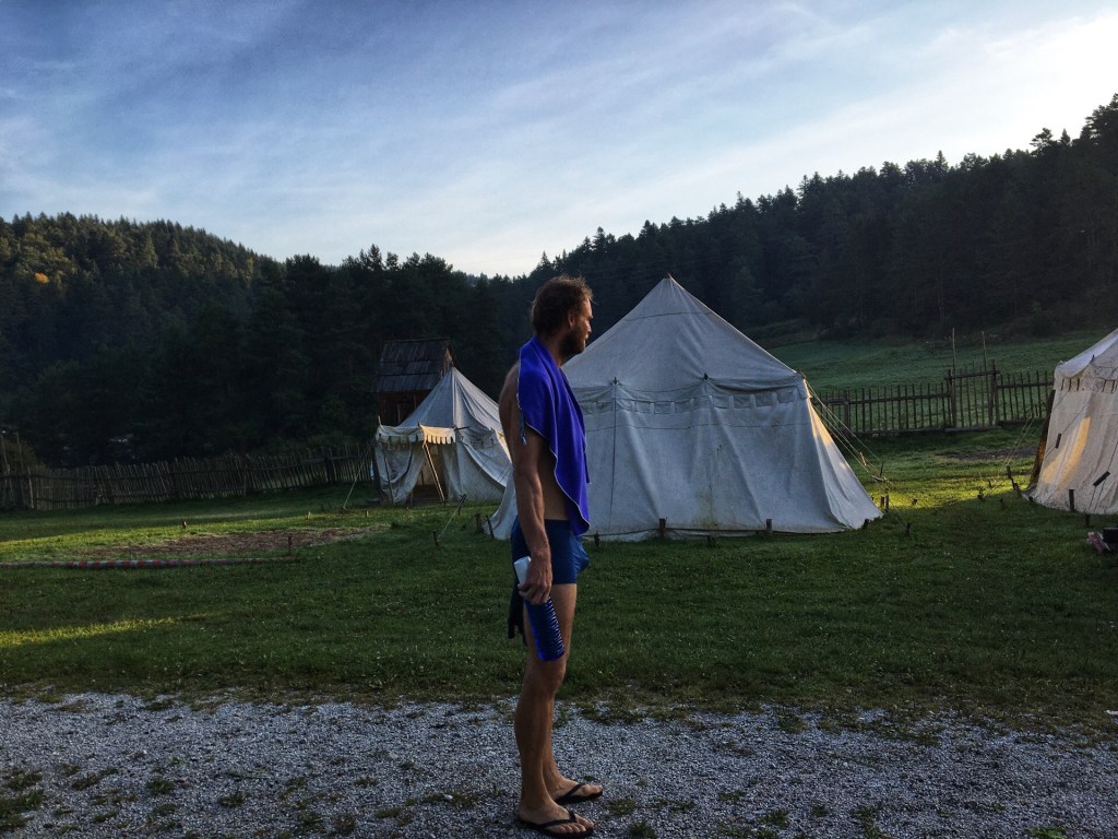 We slapen zacht in het middeleeuws kamp en kruipen vroeg de tent uit om de bergen te zien liggen in het ochtendlicht. Waw wat een beauty’s. Het is goed ontwaken in het middeleeuws kamp. Er is een goeie douche en er zijn spelletjes uit vervlogen tijden. De kruisboog hebben ze jammer genoeg meegenomen.