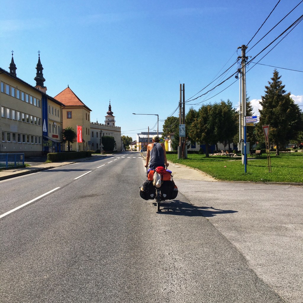 We rijden onze kasteelberg naar beneden, slaan af naar een mooi pad langs de Poprad rivier en komen na een 5-tal kilometer terug op een hoofdweg. Die is goed te doen, er is weinig verkeer en loopt gestaag van dorpje naar dorpje. De dorpjes voelen zuiders aan met hun pastelkleurige gepleisterde gevels en dikke muren. Het Tatra-gebergte ligt voortdurende naast en voor ons. Ik kan er mijn ogen niet van houden. Het lijkt snel heel dichtbij.