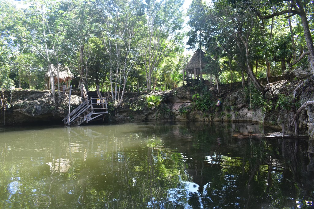 Cenotes zijn immens populair in Yucatan, het zijn in wezen grote zinkgaten of grotten die zich in de loop van de tijd hebben gevuld met koel, helder grondwater en regenwater. Op Yucatan heb je duizenden van die idyllische baden in de jungle. Langs onze weg zijn er talloze cenotes, sommigen klein met een houten bordje aangegeven en een dirt road die de jungle invoert, andere groot met dito billboard en grote parking voor toeristenbussen.