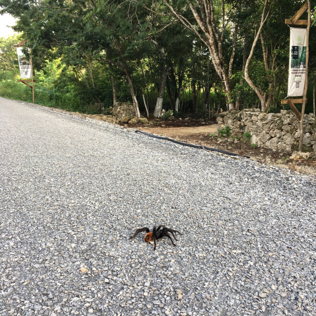 De Ruta de las Cenotes is een redelijk rustige weg met links en rechts een dicht kluwen van groen. De jungle is vlakbij en dat merken we. Een gigantische spin, zo groot als mijn hand trippelt langs de fiets.