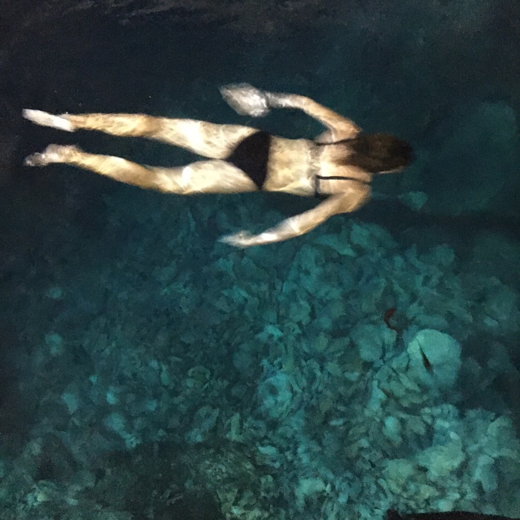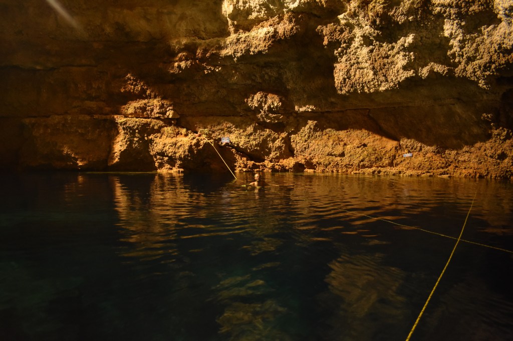 We bezoeken 2 van de 3 cenotes, Multum-Ha en Tankach-Ha. Het zijn alle 2 ondergrondse kristalheldere baden, zo helder dat je de bodem op 6 meter diep kan zien liggen. Je zwemt onder stalactieten in koud helder water. Op het trapgat na valt er geen licht naar binnen. De grotten worden kunstmatig verlicht en geventileerd. In Multum-Ha zijn we op een bepaald moment helemaal alleen. Waw! Het is er plots stil, het water glad en de diepte betoverend.