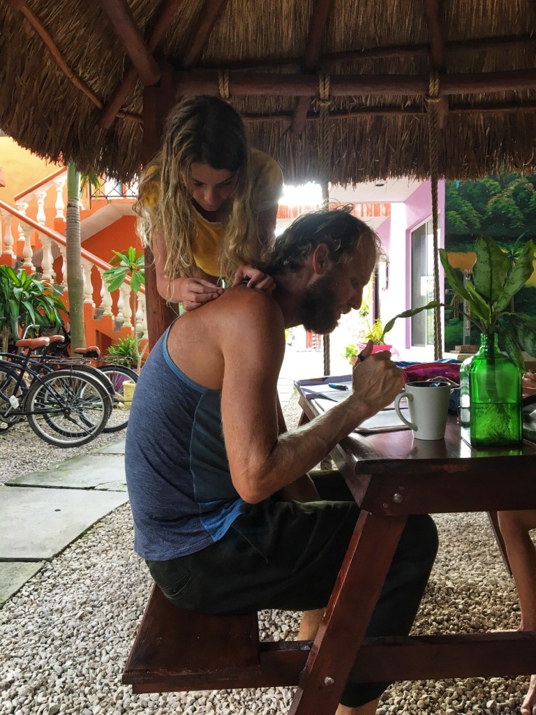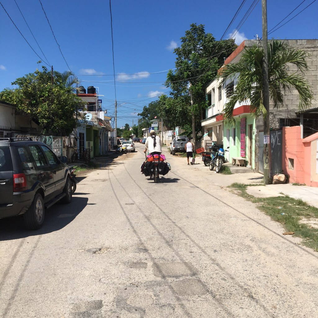 De weg is saai. Een brede hoofdweg altijd rechtdoor, veel dode tarantulaatjes. We zijn ze al helmaal gewoon, die mooie harige spinnen. De eerste 20 km zijn vreselijk om te fietsen. De tropische berm is een stortplaats. Om de zoveel meter waait een walgelijke kadaverlucht in ons gezicht. In de berm liggen talloze zwarte zakken. Sommige liggen open en tonen hun inhoud. Veel plastic maar ook veel dierenbotten en rottende huiden. Slachtafval en omver gereden honden. Ze houden van plastic in Mexico. Alles wordt apart verpakt in zakjes en plastiekjes. In de eetkraampjes in Puerto Morelos werd ook niet afgewassen maar werd er over je bord een plastic zakje getrokken. De plastic berg is hallucinant en grote hoeveelheden afval liggen in de berm langs de weg.