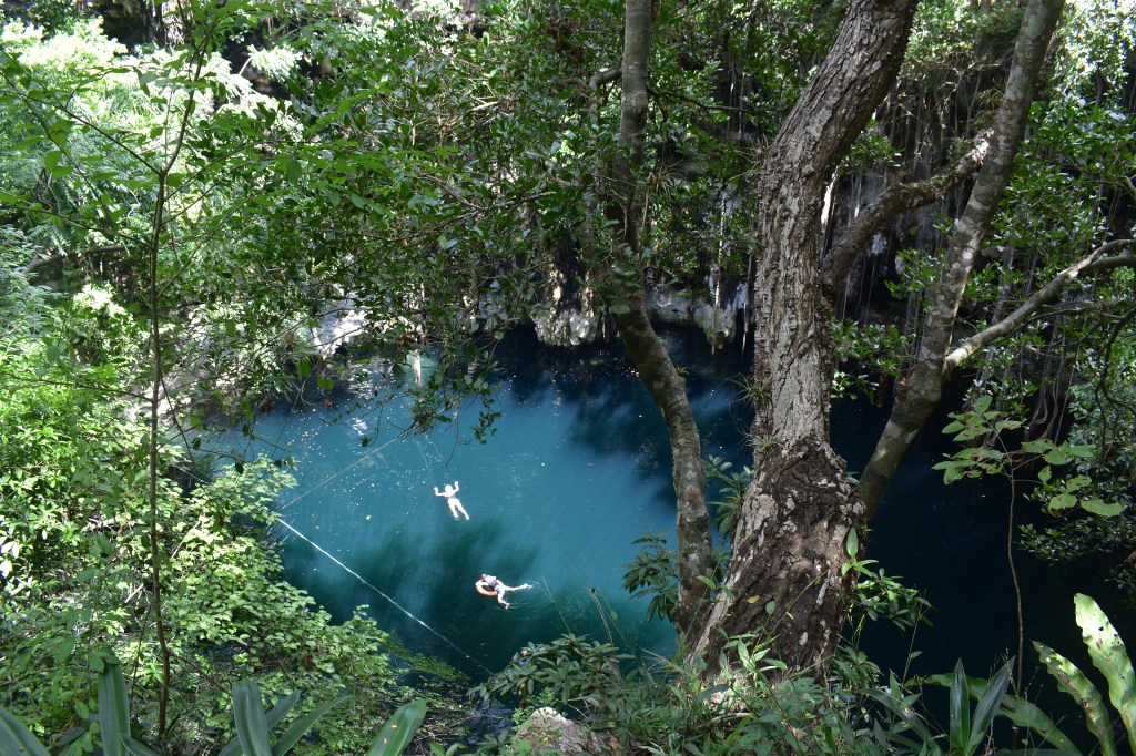 Tegen 12u zijn we op onze bestemming voor vandaag, Yokdzonot Cenote. Een sympathieke cenote met een restaurantje en plaats om te kamperen. Het water is heerlijk verfrissend, perfect om af te koelen na alweer een tropische etappe.
