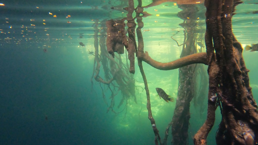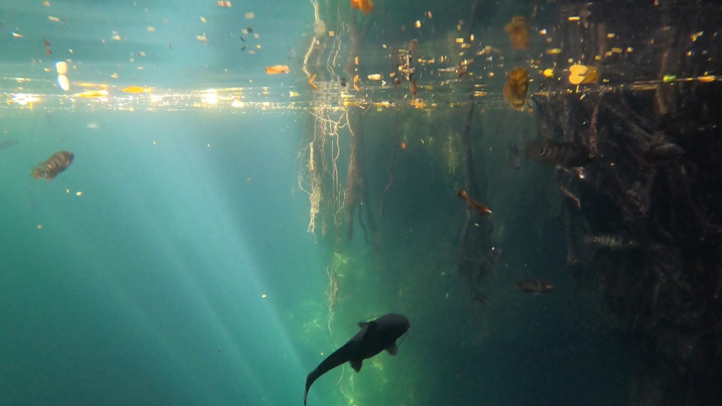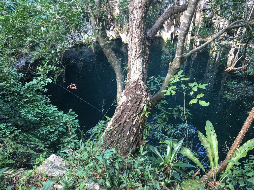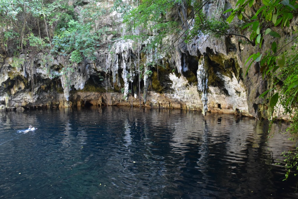 Het is een zalige namiddag. De cenote is de mooiste en goedkoopste die we al bezocht hebben en er is bijna niemand. Het water is knalhelder en 45 meter diep. Het is prachtig snorkelen, de wortels van de bomen hangen als lianen naar beneden en lopen onder water verder. Er zwemmen veel vissen die niet schuw zijn en traag voor je uit zwemmen.