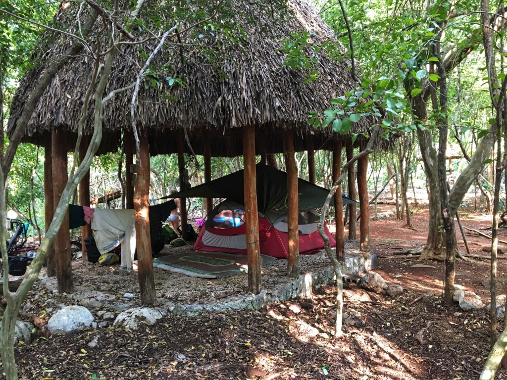 Tussen het presidenten door zetten we de tent op onder een afdakje naast de cenote. Rits en zakken dicht houden schatjes, jullie hebben gezien hoe groot de spinnen hier zijn.