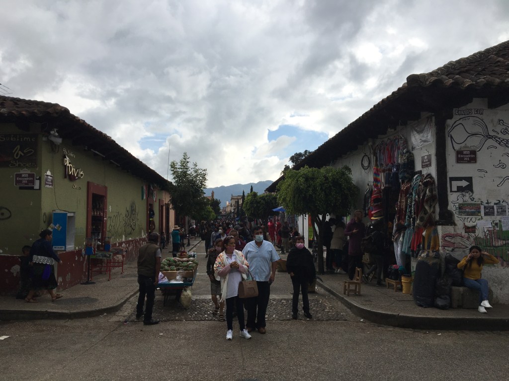 En dan is het leuk om te fietsen, het koele centrum door van San Cristobal. We zitten op 2.500 meter hoogte, het is 17 graden wat na 3 weken vergaan van de hitte heel prettig aanvoelt. De stad ligt omgeven door bergen, het is een andere wereld dan die van Yucatan. De stad is levendig, heel erg gericht op backpackers met overal hotelletjes, restaurants, koffiebars, kraampjes en veel Europese jongelui. Het is een plek waar veel volk blijft hangen en wij wellicht ook. We hebben 2 nachten geboekt in een charmante hostel maar beslissen al snel om ons verblijf uit te breiden.