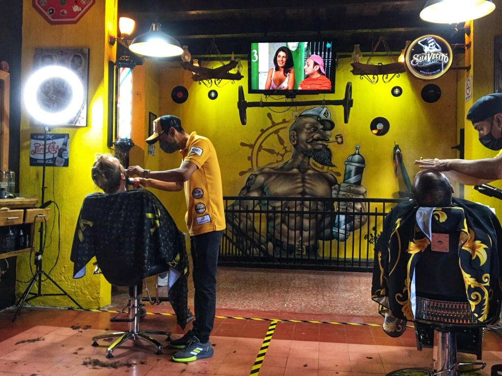 Aan de Templo de San Caralampio vinden we een kleine barbershop op de eerste verdieping van een gebouw op het plein. Bart wil zijn baard en nektapijt kortwieken. Dat kan, hij is de volgende aan de beurt. We wachten. De kappers werken zeeeeeer zorgvuldig. Er wordt gebrusht, gekamd, gebalsemd, geborsteld, gestoomd, met een fijn schaartje bijgeknipt en dan opnieuw gebrusht, gekamd, gebalsemd, … We wachten een uur en kijken gefascineerd toe. Bart krijgt dezelfde schoonheidsbehandeling. Hij wandelt naar buiten, geurend naar allerlei crèmes en zijn haar helemaal glad achterover.