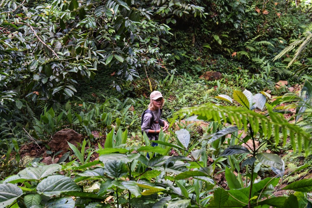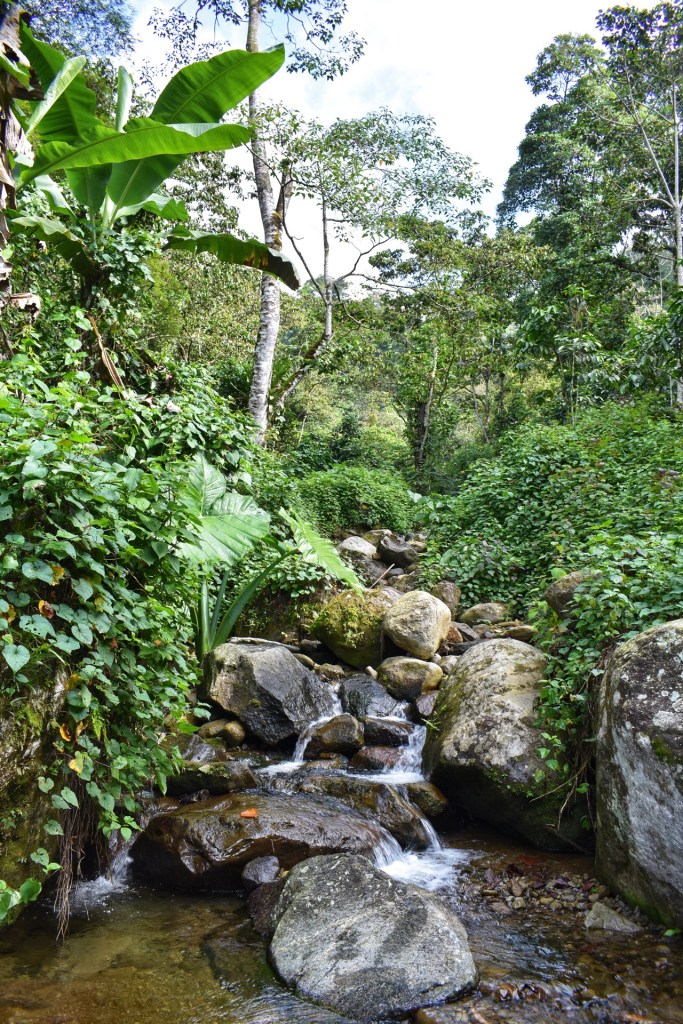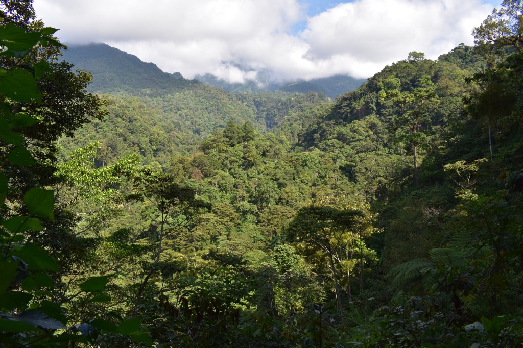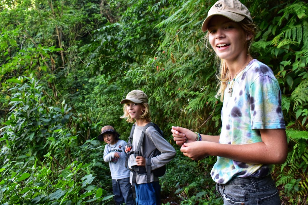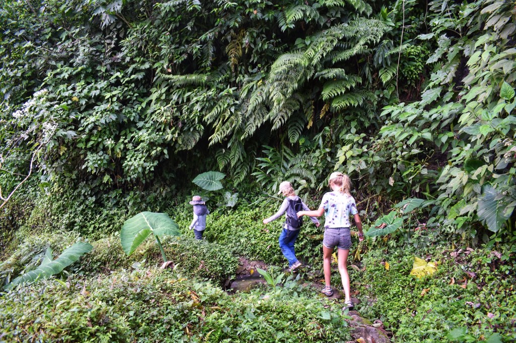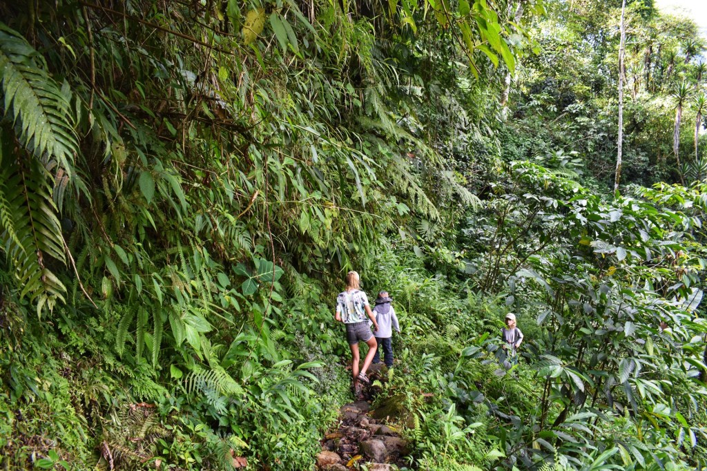We wandelen langs een smal pad in de jungle naar beneden, een dal door en daarna weer naar boven naar het uitkijkpunt. Santiago en Ramon vinden elkaar helemaal, Santiago kwettert maar door en Ramon zegt op alles si. Nanou is ook in vorm. Zolang de wandelingen uitdagend genoeg zijn is ze er helemaal voor te vinden en met Santiago in de buurt ligt het tempo in haar favoriete zone. We wandelen 7 km door de jungle naar het uitkijkpunt. Prachtige kilometers, ik geniet van elke stap door dit immens groene landschap.