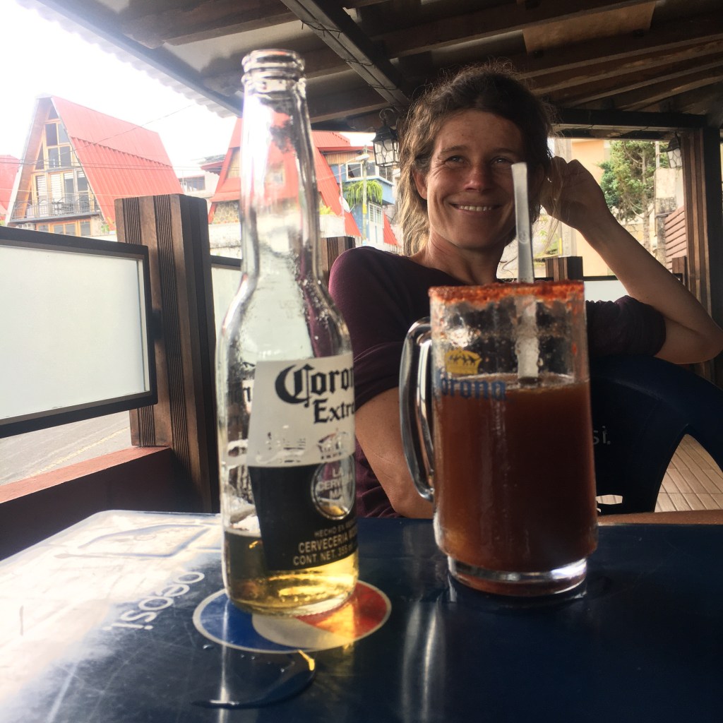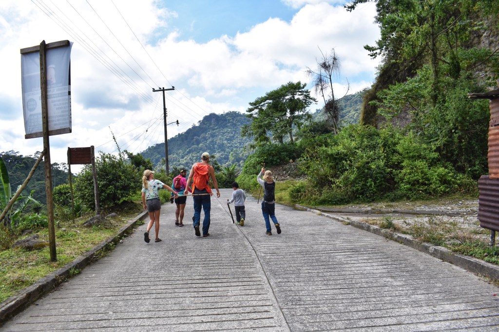 Luiz neemt de kinderen mee in zijn auto terug naar het dorp. Romeo, Bart en ik wandelen een stukje langs de weg terug, krijgen een lift in een pick up tot aan de hoofdweg en nemen nog een busje terug naar Union Juarez. Het busje legt de weg af die we gefietst hebben. We realiseren ons nogmaals hoe stijl de weg was!