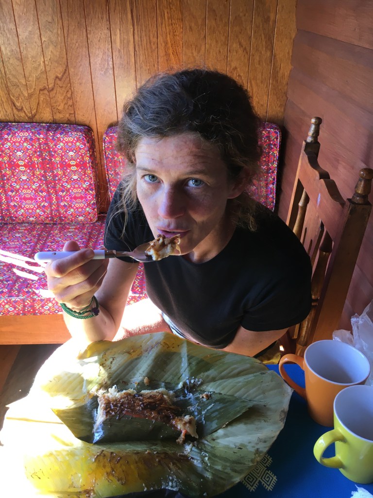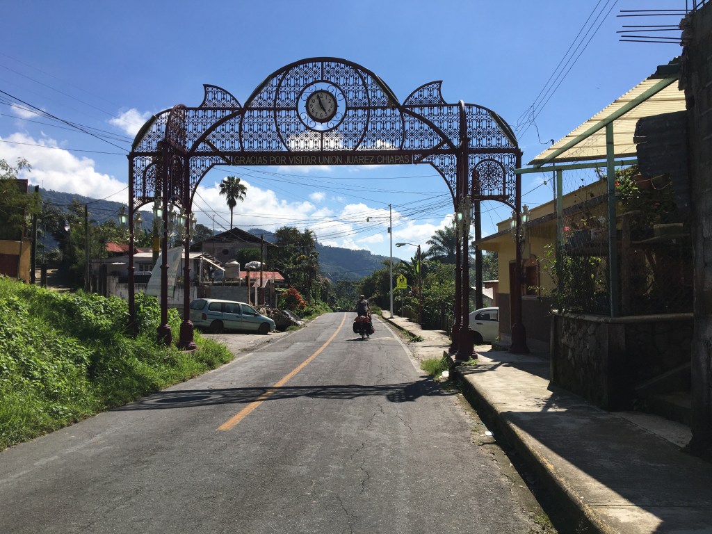 Onze casa is verhuurd vanaf vandaag anders bleven we nog een dagje in dit fantastische dorp. Union Juarez, we will meet again. En Luis, Karlita en Santiago tambien! We nemen afscheid van deze mooie mensen, krijgen hun zegen en nog een zak lekkere tamales met kip en mole als ontbijt. Lekker zoet en ideaal om op te fietsen. Zelfs de kinderen eten mee. Na weken hun neus op te trekken voor tamales vinden ze deze exemplaren lekker.