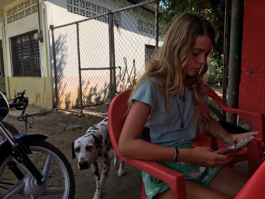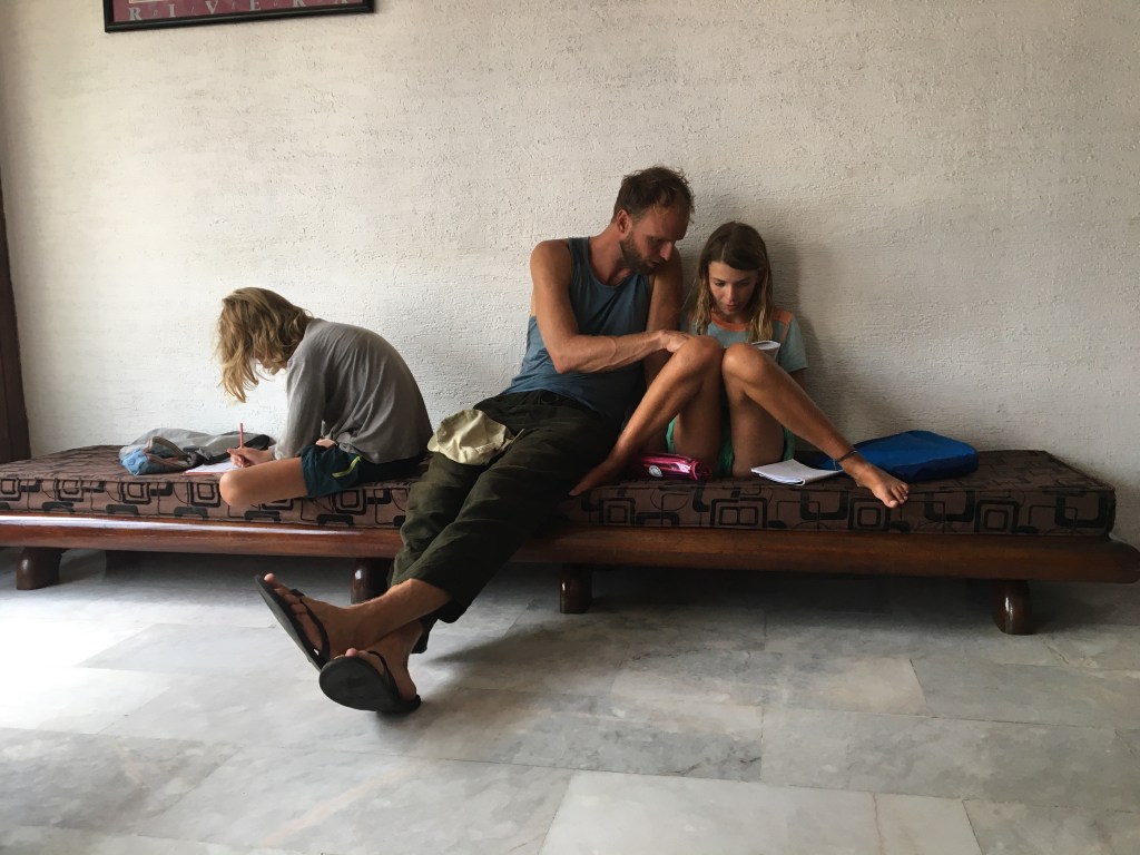Jullie zien er wel wat geslagen uit door de hitte… Hier zitten we aan de haard- en plaid-fase.