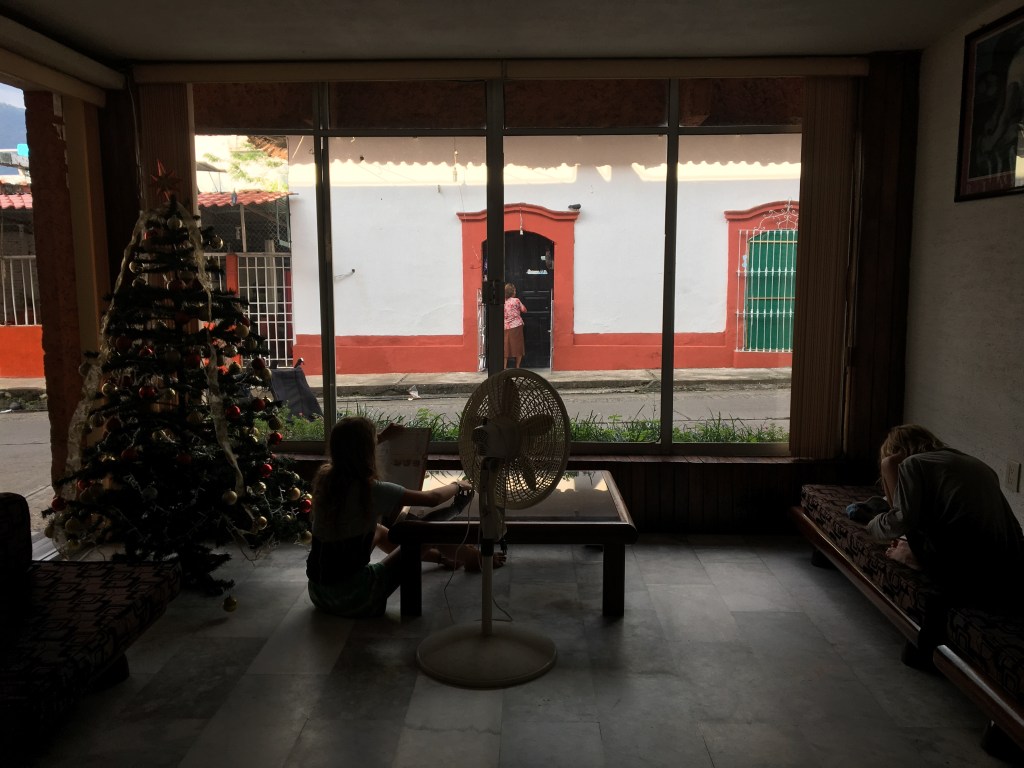 Na de brousse volgen nog een dikke 30 km langs een grote weg. Het is ondertussen zeer zonnig en zeer warm. We rijden tot in Huixtla, een levendig stadje tussen oceaan en bergen. Er zijn veel hotels, de eerste 2 zien er groezelig en smerig uit. Een man op motor wijst ons de weg naar een derde hotel, Don Carlos, en daar is het wel goed.