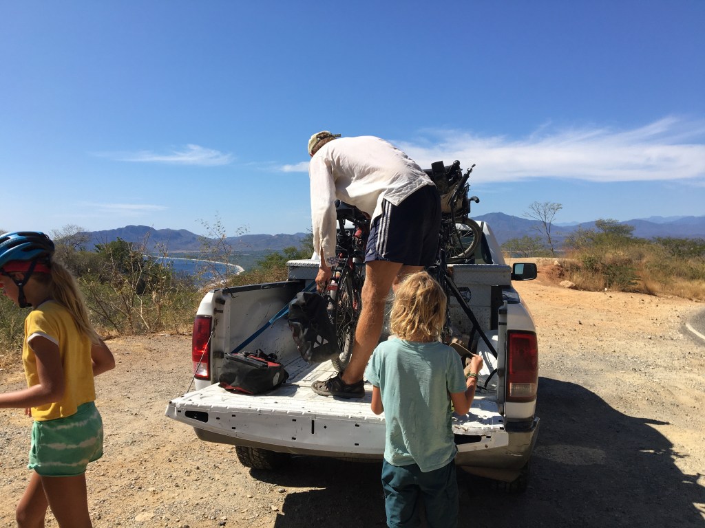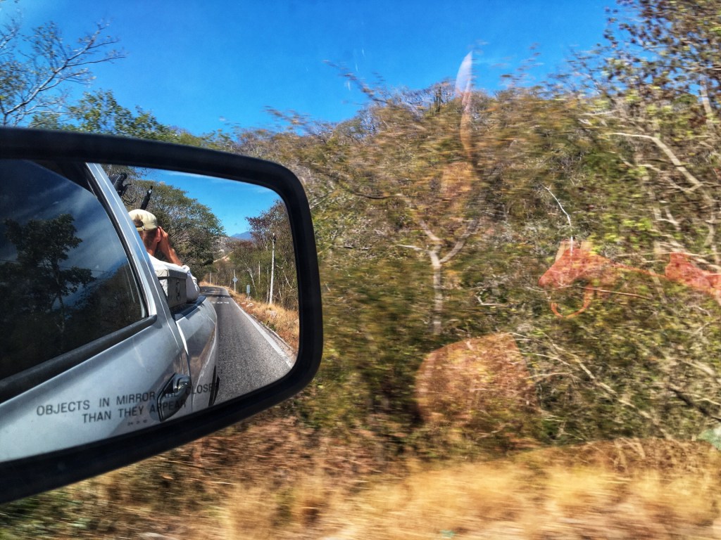 Het is alweer warm en zeer winderig wanneer we vertrekken. My God wat een stoffig winderig oord is dit. Onze volgende halte is Bara de la Cruz, 105 km verderop. We plannen 2 dagen om er te geraken, 70 km vandaag naar het volgende stadje Santiago Astata en 35 km morgen. De kustlijn is droog en rotsachtig en de weg heuvelachtig. Wanneer we de winderige vallei uit zijn gaat het omhoog. De lucht zindert van de hitte en het klimmen gaat moeizaam. Gelukkig komt er nog wat restwind aangewaaid uit de vallei die voor iets van verkoeling zorgt. De eerste klim is de zwaarste van de dag en er lijkt geen einde aan te komen. Wanneer de plaat van uberdope voor de tweede keer opnieuw heeft gespeeld – geen fut om iets anders op te zetten – zijn we eindelijk boven en kan het dalen beginnen. Na een paar bochten staat een witte pick-up die ons net passeerde op een uitkijkpunt en doet teken om te stoppen. Of we geen lift willen? Hij rijdt naar de luchthaven van Huatulco. Dat is helemaal onze richting en we nemen het aanbod zeer graag aan. De fietsen gaan met Bart in de laadbak. Nanou, Ramon en ik kruipen voorin bij Daniël. Daniël houdt van religieuze muziek en zingt luidkeels mee met de liederen over Dios en Jesus. Ondertussen rijdt hij hard door het droge heuvelachtige landschap en wijst op de weg wanneer het stijgt. Wat zijn we blij dat we dit vandaag niet moeten trappen.