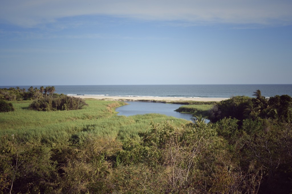 In plaats van morgennamiddag zijn we vandaag al vroeg in Bara de la Cruz. We installeren ons in 2 cabanas op 500 meter van het strand, lunchen in de schaduw van een palapa en wandelen in de late namiddag nog eens naar het strand. De baai is fantastisch mooi, met fijn zand, gekke rotsen en machtige bergen die oprijzen achter het strand. Er zijn mooie surfgolven en er liggen veel surfers in het water. Bart haalt een plank en legt zich ertussen. Het water is ondanks de kletsende golven zeer helder, er vliegen pelikanen over, in de verte zien we dolfijnen springen.