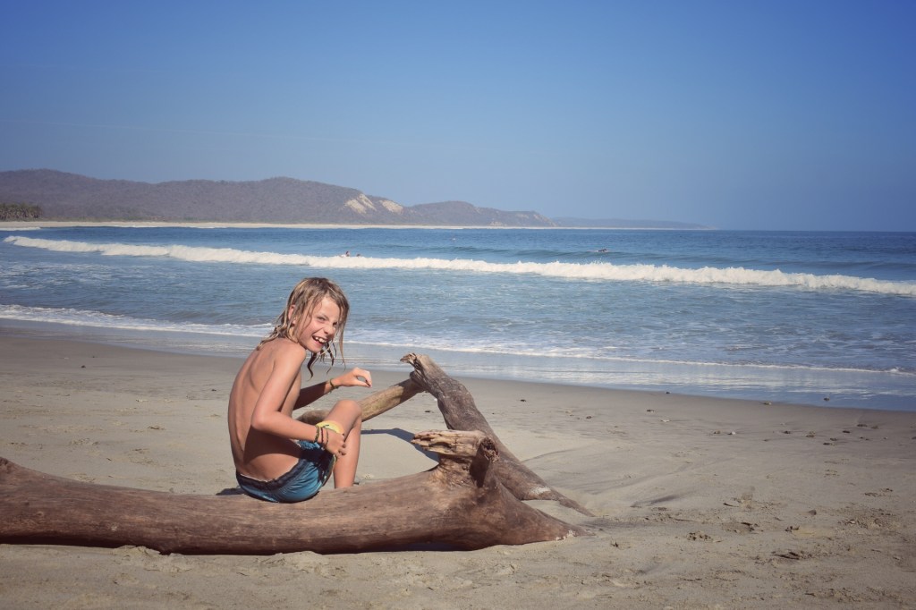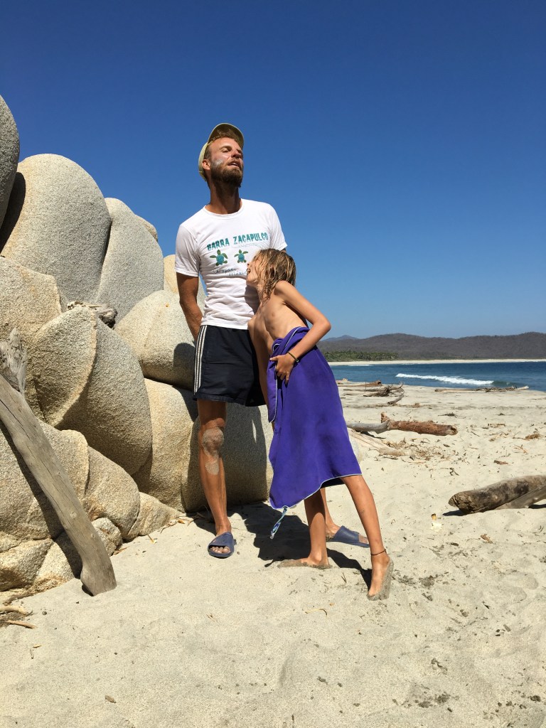 We gaan er helemaal in op, liggen elke dag uren in het water en krijgen veel tips van onze nieuwe vrienden. Een beetje meer naar voor, langer peddelen, meer je benen optillen,… Na een paar dagen zijn we geradbraakt maar kunnen wel een golf pakken en meesurfen, eerst enkel rechtdoor naar de kust, na een paar dagen ook mee met de golf parallel aan de kust. Een zalig gevoel. De dagen glijden voorbij en bestaan uit slapen, surfen, eten en hangen. We zijn in trance en verliezen elk gevoel van tijd tussen zonsopgang en zonsondergang. ‘s Avonds loopt het zeewater uit onze neus en hebben we een zilte adem. De kinderen brengen de dagen door op het strand en rond de cabana, zeeschildpadjes door de branding helpen, stenen verzamelen, in de golven duiken, rotsen klimmen, armbandjes maken voor de knappe Duitsers… Ze zijn experts geworden in de dag doorprutsen en willen hier nooit meer weg. Ze genieten ook heel erg van het contact met andere mensen. Nanou leert de Duitsers de swisj, Ramon wordt the red buffle, de onverslaanbare worstelkampioen. Na een paar dagen rijden ze ook niet meer mee op de fiets maar zitten ze in Daniël zijn busje. Fantastisch vinden ze dat!