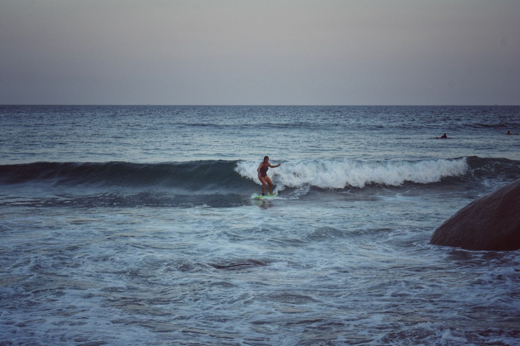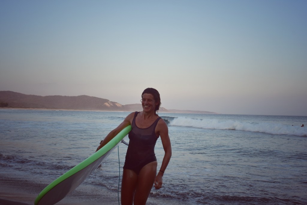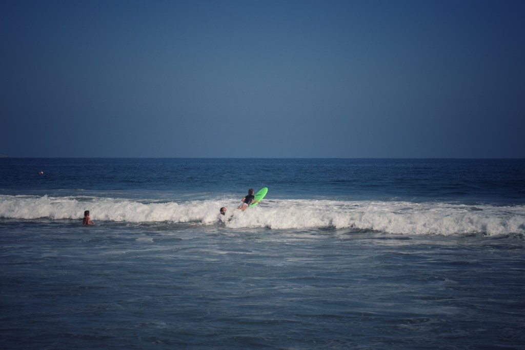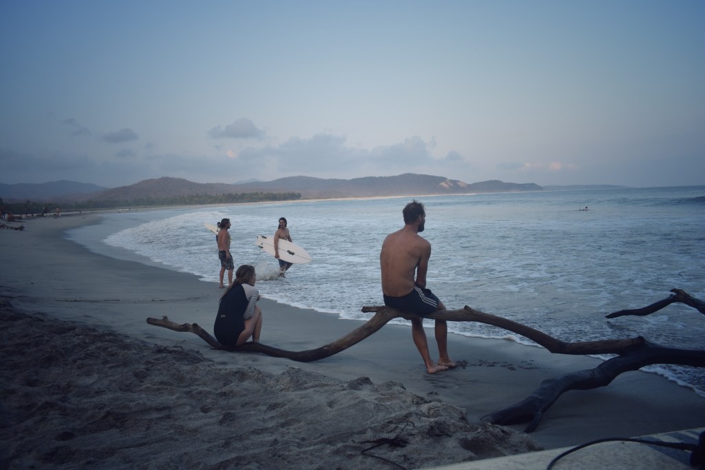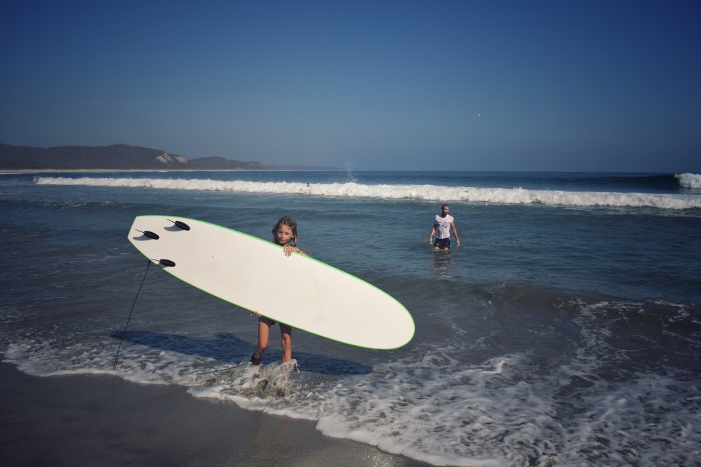 De eerste dagen van onze tiendaagse is er “no surf”. Barra de la Cruz is een bekend surfgat, hoge golven, zotte barrels, er wordt hier serieus gesurft. No surf betekent niet dat er geen golven zijn. Ze zijn er wel degelijk. Geen hoge, geen erg lange rides maar wel echte golven die mooi afrollen en bij momenten wonderlijk consistent zijn. Perfecte omstandigheden om te leren en om peddelspieren aan te maken. In het water liggen ook enkele lange termijn surfers, in love with the ocean en altijd onderweg naar golven. Klein, groot, choppie,… voor hen maakt het allemaal niets uit, zolang ze maar in het water kunnen liggen en glijden. Ze zijn jong, knap, bruin en logeren op hetzelfde adres als wij, Pepe’s Cabanas. Nanou kijkt er helemaal naar op, naar die blonde mooie grote mensen met hun modieuze beachwear en hun snelle bochten op het water. We trekken op met het kleine groepje knappe Duitsers en met Simon, een atypische Nederlander. Het voelt al snel heel vertrouwd en sympathiek.