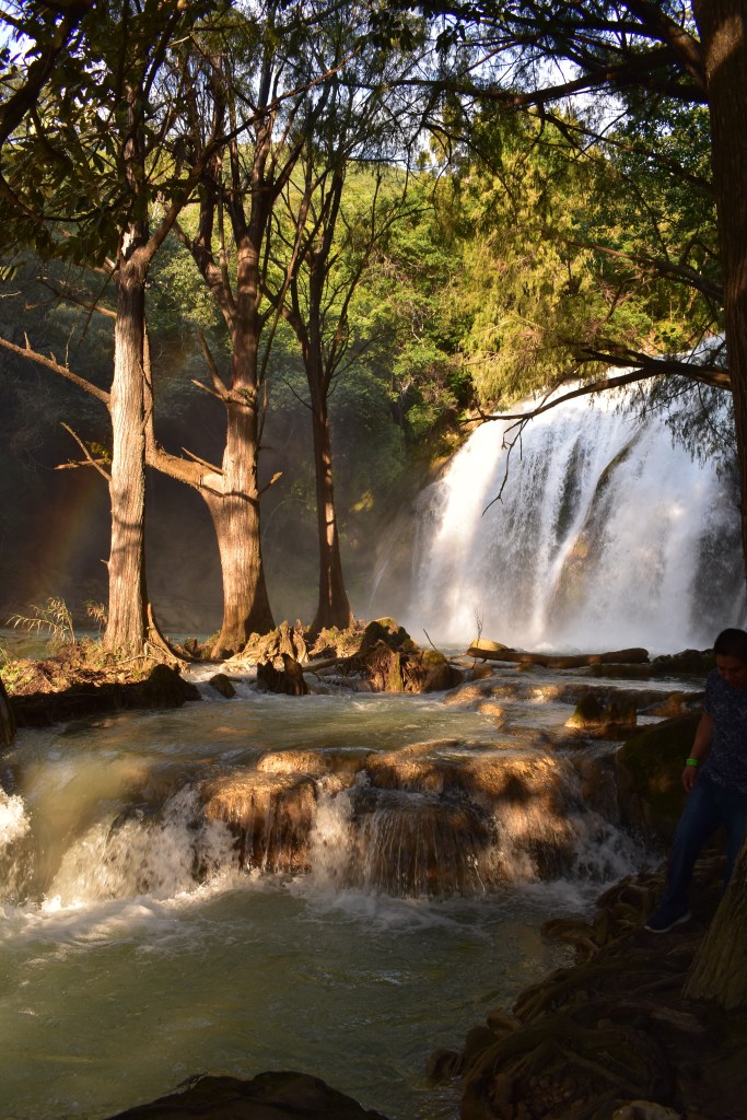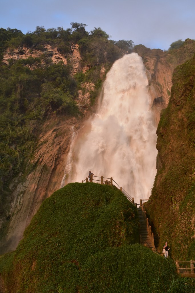 Wekker, opruimen, bagage laden en naar het busstation fietsen. Nu we weten dat de pino’s in de grote ADO bussen passen ligt Mexico helemaal open. We nemen de bus naar Comitán en vandaar fietsen we naar Chiflon. Chiflon is een populaire stop, er zijn watervallen waarvan de hoogste een verval heeft van 250 meter. Het water heeft dezelfde blauwe kleur als in Aqua Azul.
