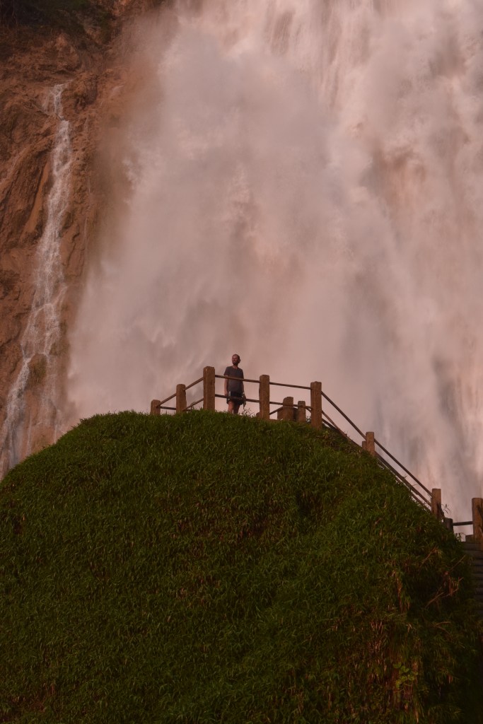 De laatste kilometers rijden we langs gladde asfalt naar Chiflon. We kunnen kamperen maar er zijn ook cabanas. De cabanas zijn aanlokkelijk, warme douche, groot bed en uitkijkend op de azul rivier. Hmmmm twijfel twijfel. Het worden cabanas natuurlijk. We wandelen nog eens naar de watervallen. Ze zijn prachtig en in het avondlicht des te meer.