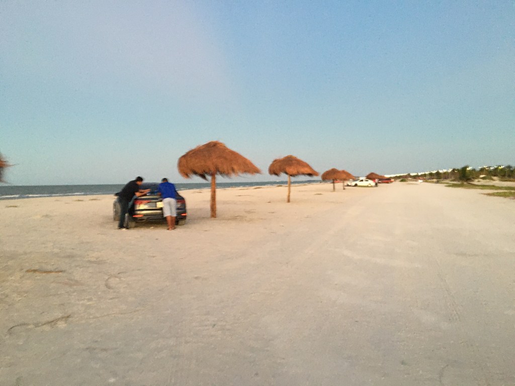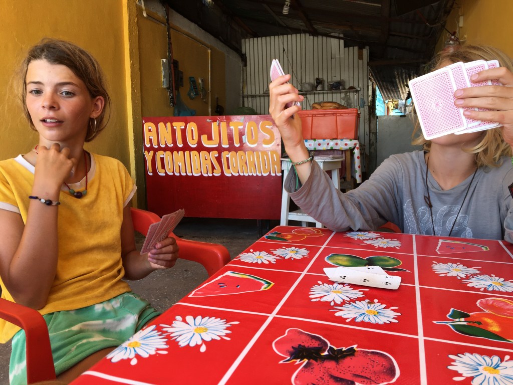 Bart vraagt plaatsen voor 4 volwassenen en 2 fietsen richting San Cristobal. Tickets rollen uit de printer, 1 lange strook van anderhalve meter lang. Niemand stelt vragen over de afmeting van de fietsen. De bus vertrekt om 01:50 ‘s nachts. Dat wordt een lange dag. Het is pal op de middag en warm. We dwingen onszelf tot actie en rijden naar Playa Norta, een breed strand op 4 km van het busstation. Het strand heeft iets van een drive-in. Om de 5 meter staat er een palapa (een parasol van palmbladeren) met een auto naast. Mensen komen het strand opgereden, installeren zich onder een palapa, halen frisdrank en snacks uit de koffer en genieten van strand en zee (en boorplatformen, we tellen er 11). Het valt wel op hoe achteloos er vervuild wordt. Rondom ons alleen maar dikke auto’s en bijna niemand neemt zijn afval mee, plastic flessen en bekertjes belanden gewoon op het strand. De kinderen kijken met verstomming, de vanzelfsprekendheid waarbij afval achtergelaten wordt is hallucinant.