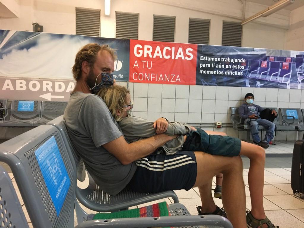 Wanneer het donker begint te worden rijden we terug naar het busstation voor een potje wachten op de bus. Ik ben er niet gerust in. De fietsen zien er gigantisch uit, zelfs in compacte toestand. Ramon valt in slaap, Nanou heeft wifi gevonden en vat post bij het oplaadstation. Het wachten duurt lang en de wachtruimte nodigt niet uit voor een dutje.