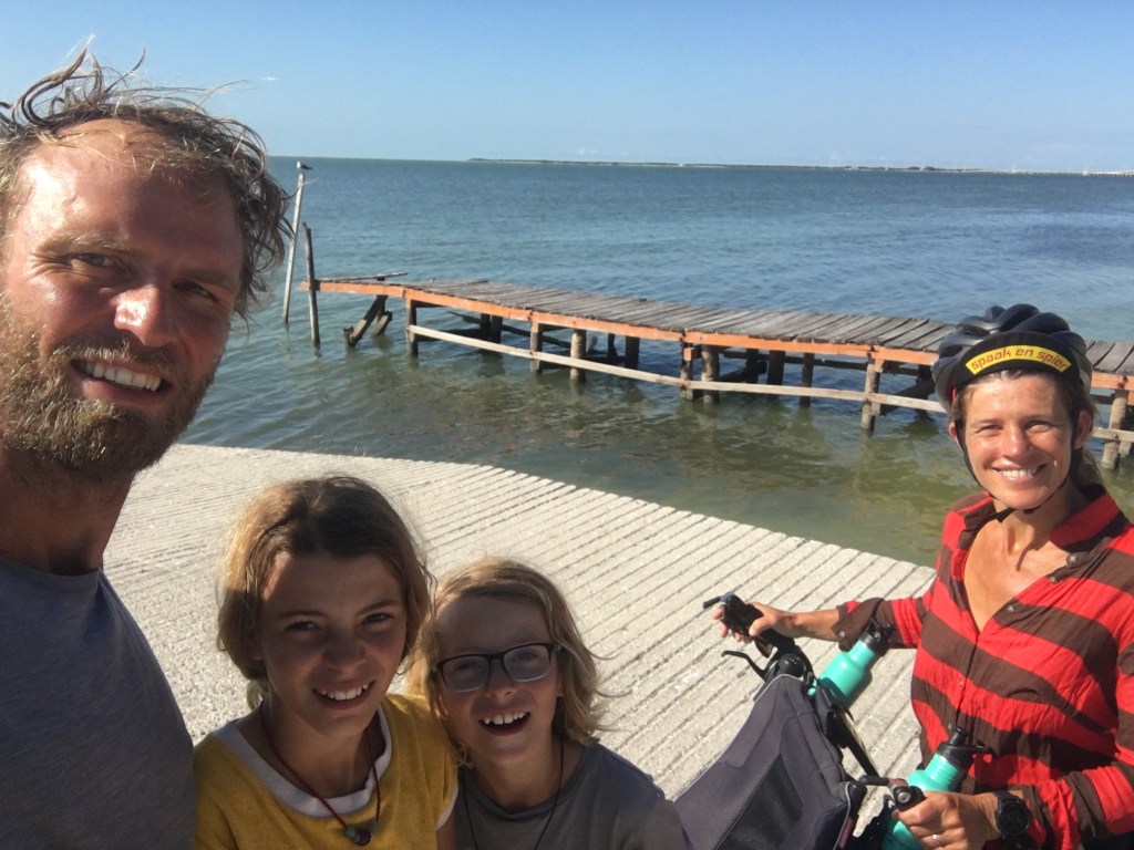 We rijden 55 km in de ochtend. De wind zit minder goed dan we verwacht hadden, maar het is niet te heet – Ramon heeft zelfs een truitje aangetrokken – en het is mooi rijden. Links van ons ligt mangrove en rechts van ons de zee. Links zitten de gieren, rechts zwermen pelikanen. Prachtig om te zien. De nabijheid en de aanblik van de zee is heerlijk, het water oogt licht turkoois met witte schuimkopjes.