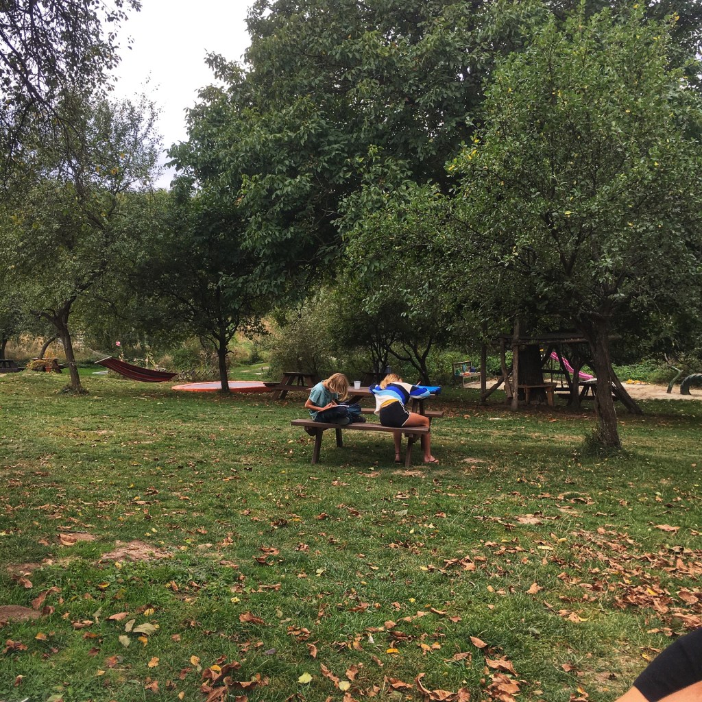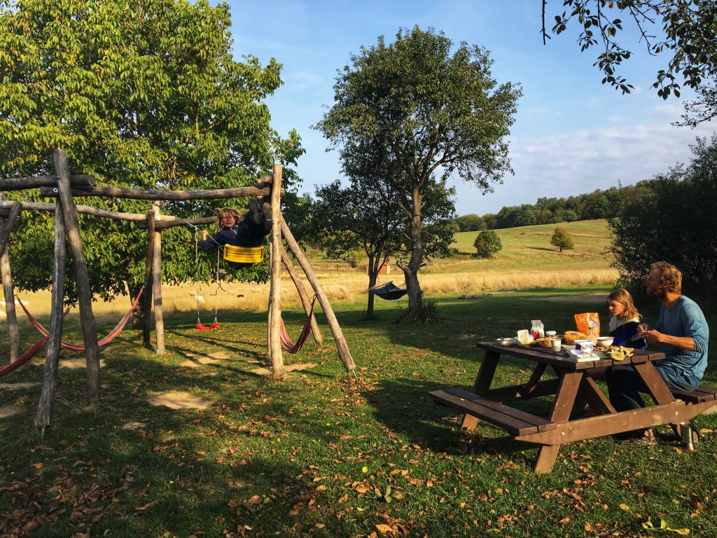 Vandaag luieren we op Camping Lazy. Lazy betekent in Slowakije buitengebied. De beide betekenissen gaan op voor deze plaats. Het is een heel mooi gebied op de buiten. Als camping 1 van onze absolute toppers. Als wij kamperen willen we vooral niet het gevoel hebben op een camping te zitten. We zitten in een heerlijke boomgaard met buitenkeuken die aan een festivalbar doet denken, Bart is in zijn nopjes met de groentetuin waaruit hij naar hartelust mag plukken, de eieren van de kippen, de geitenmelk, kaas en het boerenleven. Nanou en Ramon leven zich uit op de trampolines, in de bomen en hangmatten, aaien de poezen en vinden een vriendin voor een dag. De boerderijcamping wordt uitgebaat door een Nederlands koppel. Ze hebben een elfjarige dochter die al even graag trampoline springt als onze kiddo’s. Ik vind een wasmachine, een wasdraad in de wind, een mooi uitzicht en een hangmat. Voor onze tent is een weide met geiten en schapen. Het is off season, we zijn hier alleen vandaag. Wat een rust!